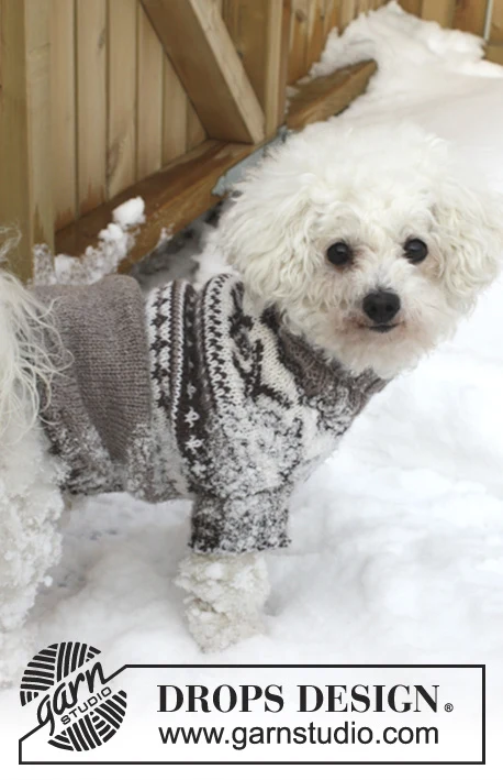 Neulottu DROPS koiran pusero ”Karisma” -langasta, jossa norjalainen kuvio. Koko XS-L.
