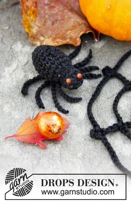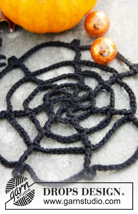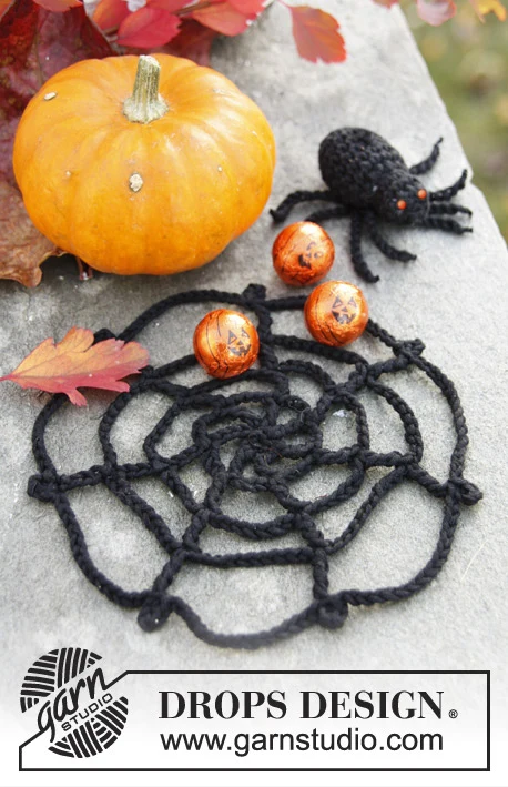 DROPS halloween: Virkattu hämähäkinverkko hämähäkillä ” DROPS Safran ” -langasta