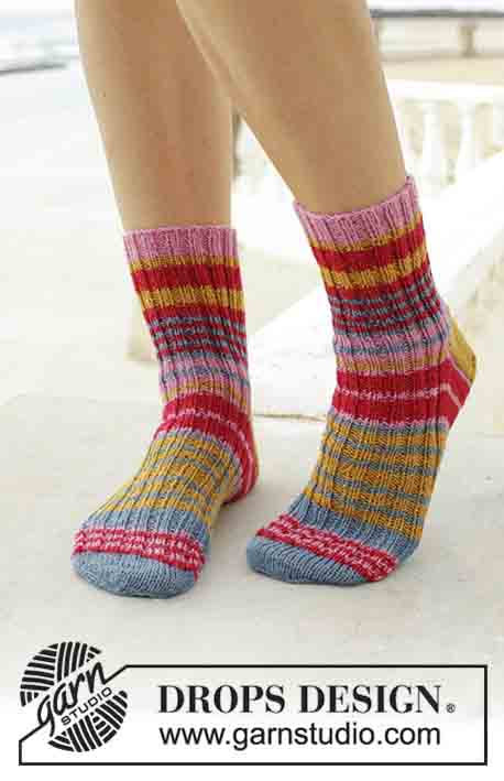 Neulotut sukat, joissa joustinne ja raidat. Koko 35-43. Työ on neulottu DROPS Fabel -langasta .