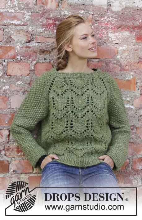 Neulottu raglanpusero 2-langasta DROPS Air. Työ on neulottu ylhäältä alas reikäkuviolla ja helmipujotuksella. Koko S-XXXL.