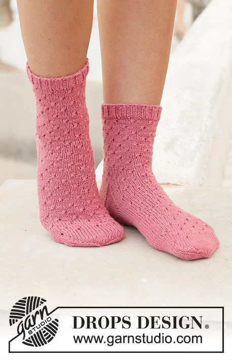 Neulotut sukat DROPS North -langasta. Työ on neulottu ylhäältä alas yksinkertaisella reikäkuviolla. Koot 35-43.