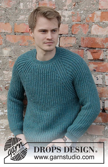 Miesten neulottu raglanpusero DROPS Sky -langasta. Työ on neulottu ylhäältä alas täydellä patentilla. Koko S-XXXL.