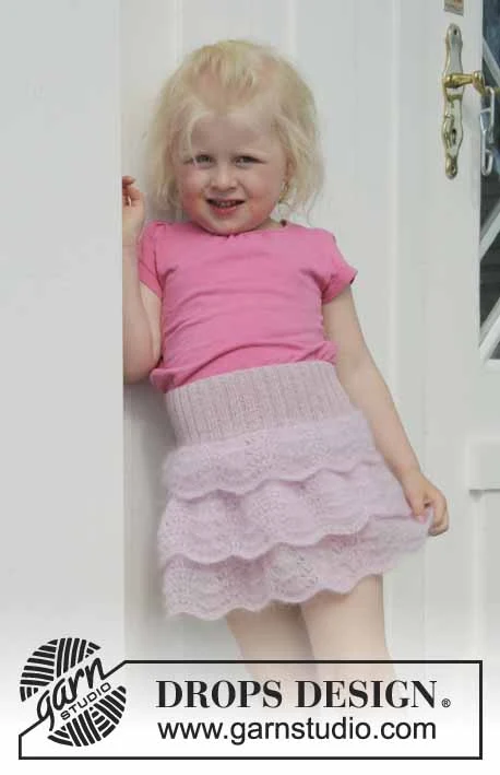 Neulottu hame, jossa aaltokuvio, röyhelöt ja joustinneuletta DROPS Kid-Silk- ja DROPS Alpaca -langoista tai käytä vain Safrania . 2-10-vuotiaille lapsille.