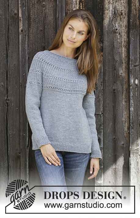 Neulottu pusero DROPS BIG MERINO -langasta. Työ on neulottu ylhäältä alas, mutta tekstuurikuvio ja sileäommel.