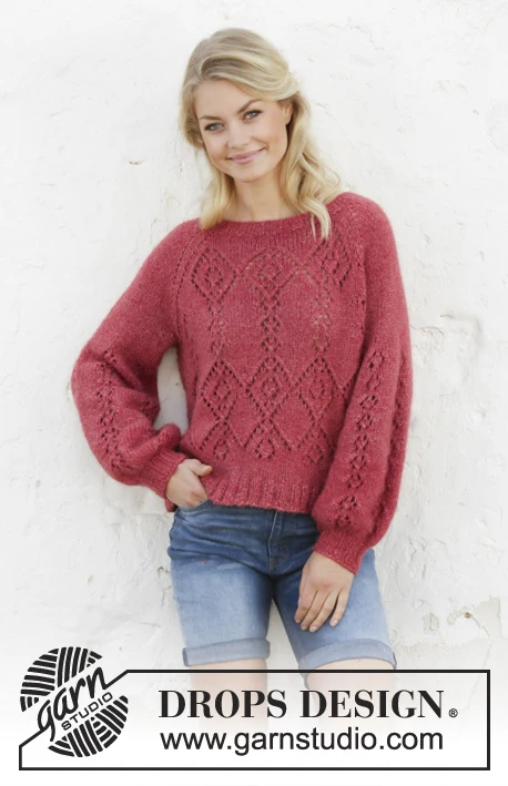 DROPS Air -langasta neulottu pusero raglan- ja ilmapallohihoilla. Työ on neulottu ylhäältä alas reikäkuviolla. Koko S-XXXL.