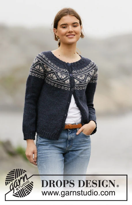 Neulottu takki DROPS Karisma -langasta . Työ on neulottu ylhäältä alas pyöreällä tukikappaleella ja pohjoismaisella kuviolla tukikappaleessa. Koko S-XXXL.