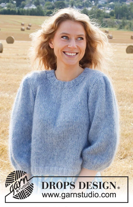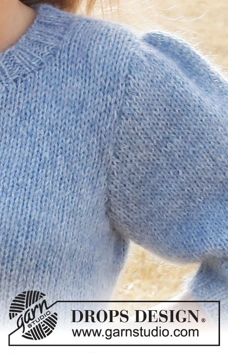Neulottu pusero DROPS Sky- ja DROPS Kid-Silk -langoista . Työ on neulottu pu-pitkillä puhvihihoilla. Koko S-XXXL.