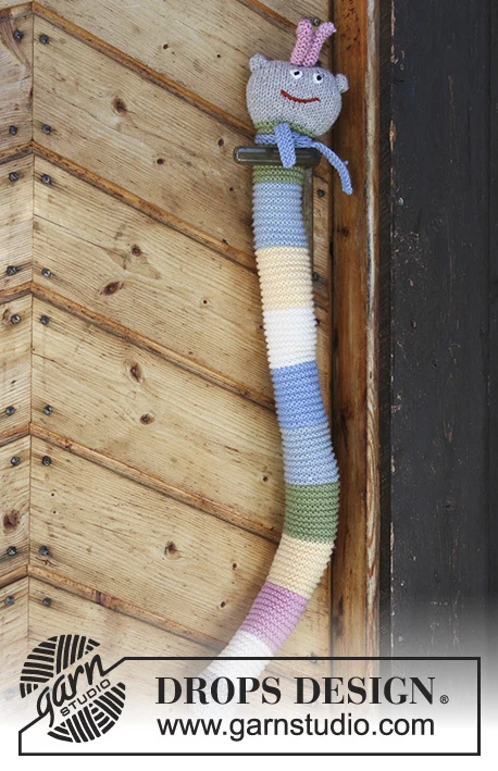 Neulotut lelut: Kaalimato ainaoikeaa raidoilla. Työ on neulottu DROPS Merino Extra Fine -langasta.