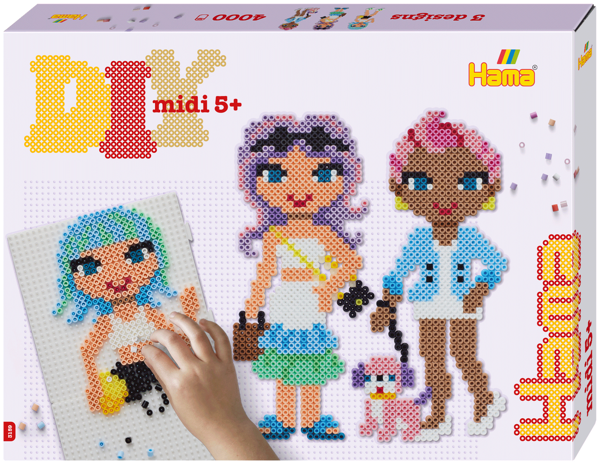 Tämä lahjarasia on ihanteellinen aloituspiste tai lisäys jännittävään leikkiin ihanien helmien kanssa. Kaksi helmalautaa voidaan yhdistää luomaan vielä suurempia malleja, kuten älykkäitä tyttöjä. Setti sisältää 4 000 Hama midi-helmeä ja suositellaan yli 5-vuotiaille lapsille.