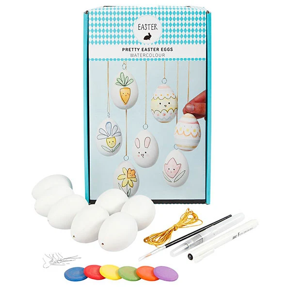 Sisältö: 7 muovimunaa, 6 erilaista vesiväriä, 1 sivellin, 1 huopakynä, 1 vesiharjan ripustus ja naru.
