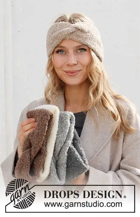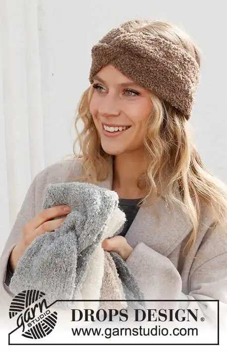 Neulottu pääpanta kierteellä DROPS Alpaca Bouclé -langasta .