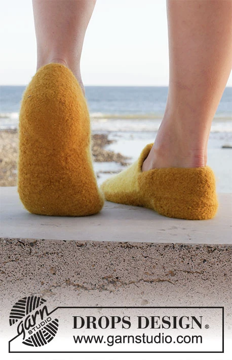DROPS Alaska -langasta neulotut huopatossut. Työ on neulottu edestakaisin kappaleena, joka ommellaan yhteen ennen huovutusta. Koko 35-46.
