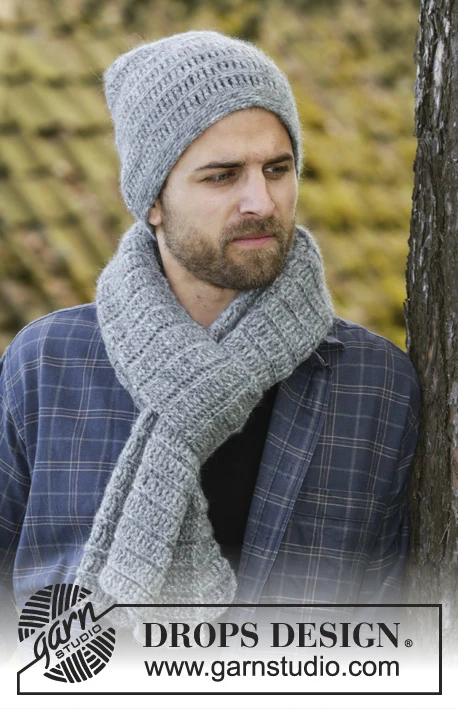 Setti sisältää: Virkattu hattu ja huivi miehille DROPS Air -langasta kaksoispuikkoompeleilla ja kiinteillä ompeleilla