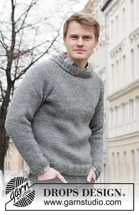 Miesten neulottu raglanpusero DROPS Eskimo / Snow -langasta . Koko S-XXXL.