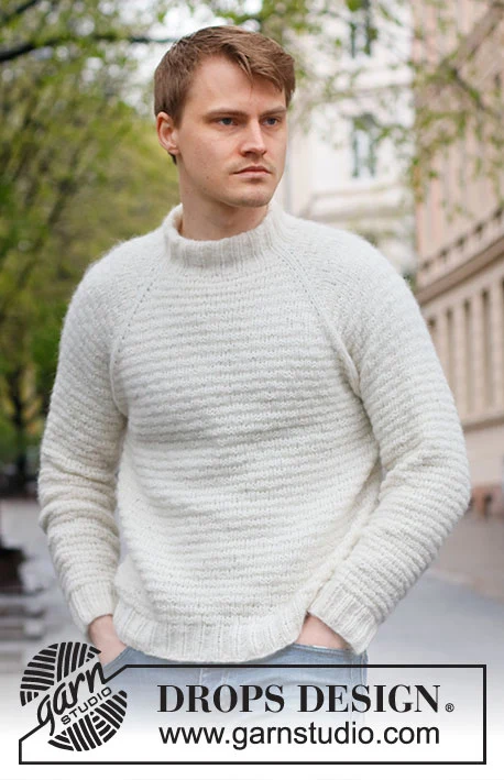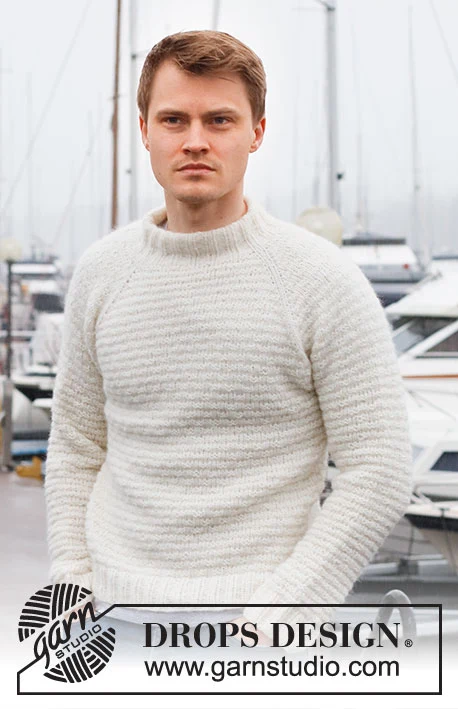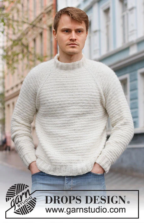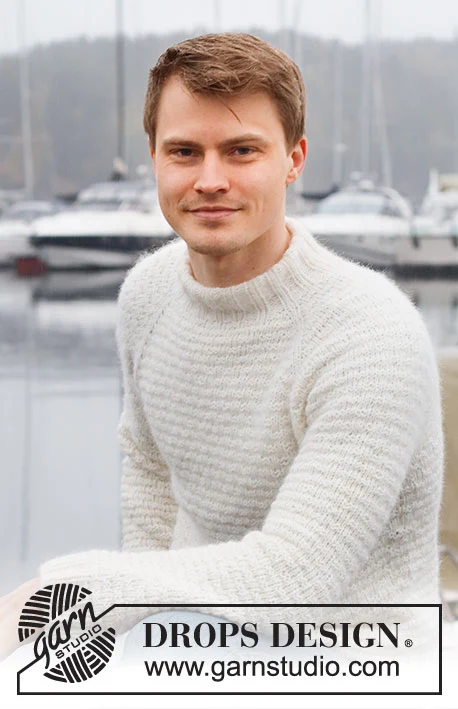 Miesten neulottu pusero DROPS Air -langasta . Työ on neulottu ylhäältä alas raglan- ja tekstuurikuviolla. Koko S-XXXL.