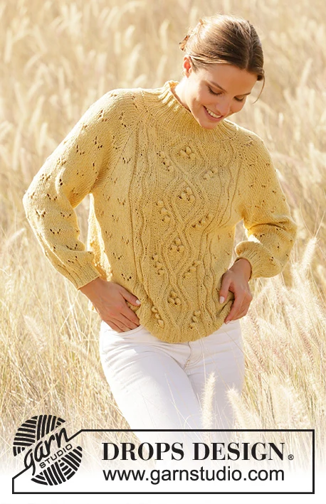 Neulottu raglanpusero DROPS Belle -langasta . Työ on neulottu ylhäältä alas reikäkuviolla, kierteillä ja kuplia. Koot XS-XXL.
