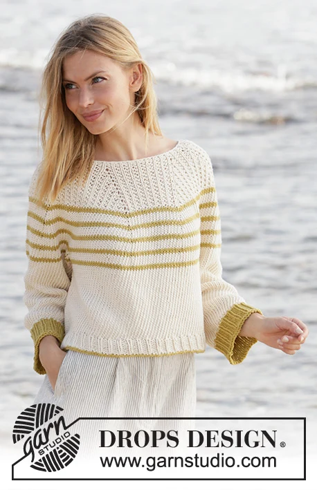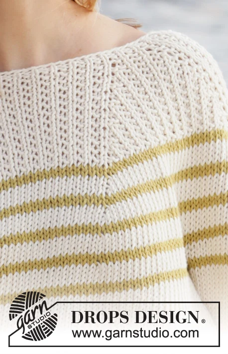 Pyöreä ainaoikeinneulottu pusero DROPS Paris -langasta . Työ on neulottu ylhäältä alas raidoilla ja tekstuurikuviolla. Koko S-XXXL.