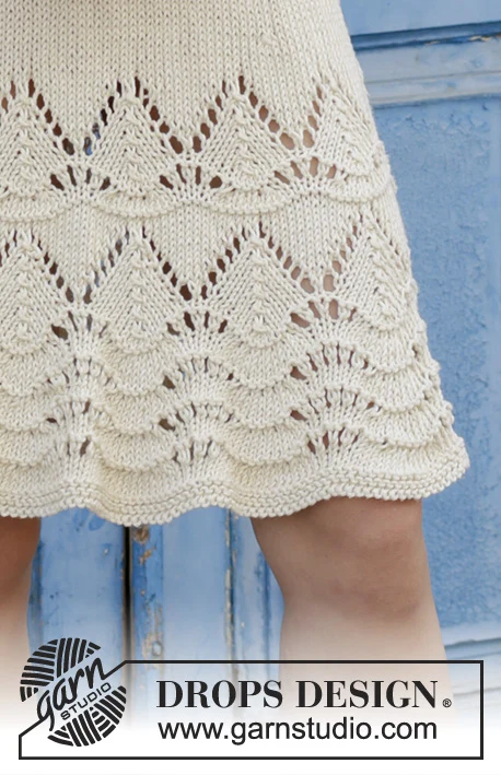 Neulottu mekko, jossa reikäkuvio. Koko S-XXXL. Työ on neulottu DROPS Paris -langasta
