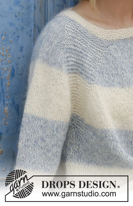 Neulottu pusero raglanilla ja raidoilla, neulottu ylhäältä alas. Koko S-XXXL. Työ on neulottu DROPS Alpaca- ja DROPS Kid-Silk -langoista