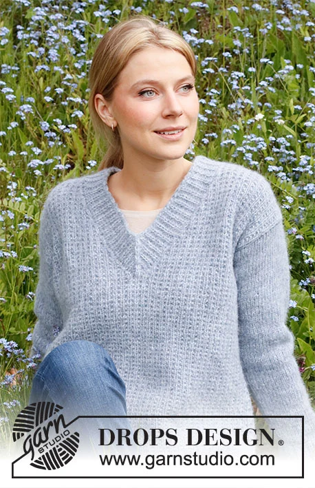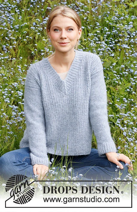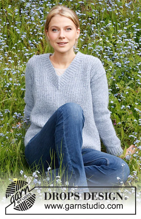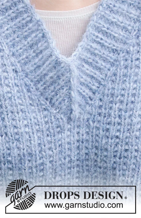 Neulottu pusero v-pääntiellä ja rakennekuviolla DROPS Air -langasta . Koko XS-XXXL.