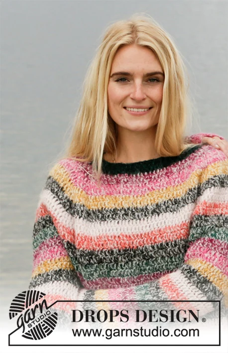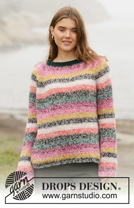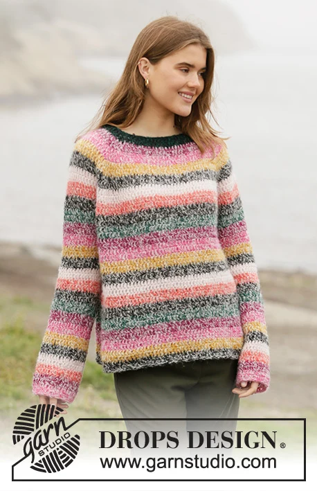 Virkattu raglanpusero 2 - lankasta DROPS Harjattua Alpaca Silk - silkkiä . Työ on virkattu raidoilla ylhäältä alas. Koko S-XXXL.