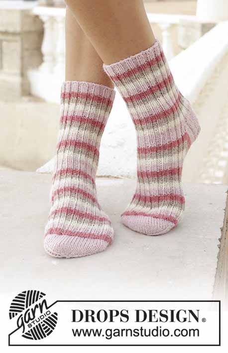 Neulotut sukat, joissa joustinne ja raidat. Koko 35-43. Työ on neulottu DROPS North -langasta.