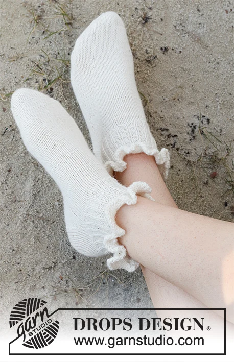 Neulotut sukat röyhelöreunalla DROPS Fabel -langasta . Työ on neulottu ylhäältä alas. Koko 35-42.