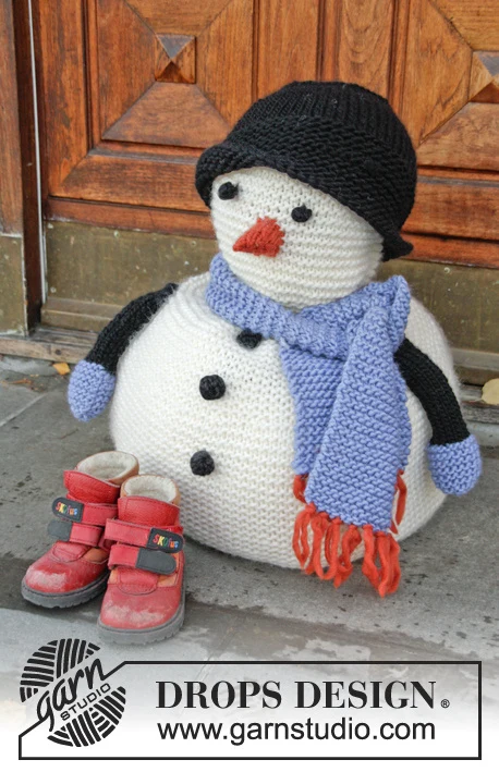DROPS Christmas: Neulottu DROPS lumiukko ”Snow” -langasta, jossa huivi ja hattu.