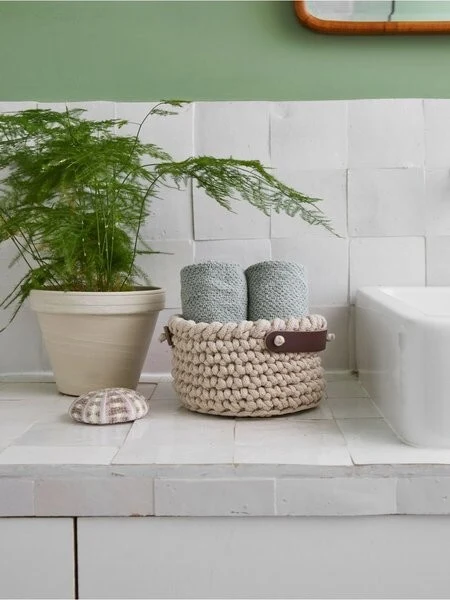 Ihana virkkaussarja DMC:ltä, jossa lanka, virkkuukoukku ja muita tarvikkeita virkatun säilytyskorin luomiseen.
