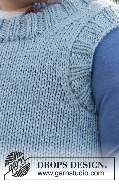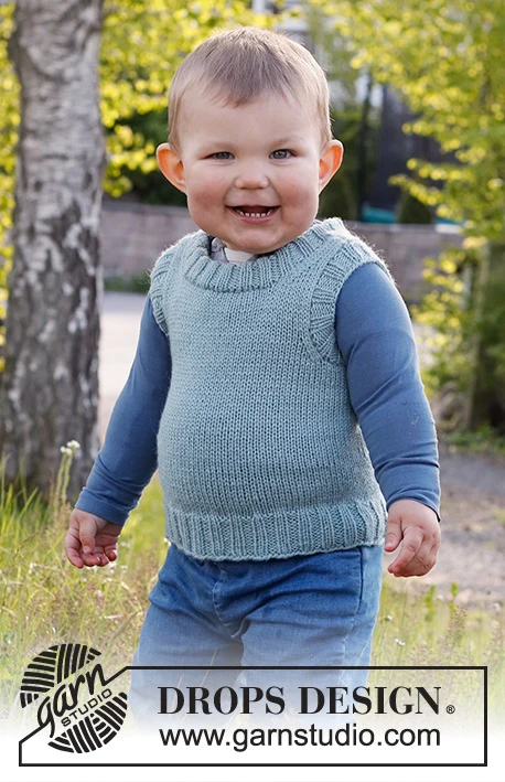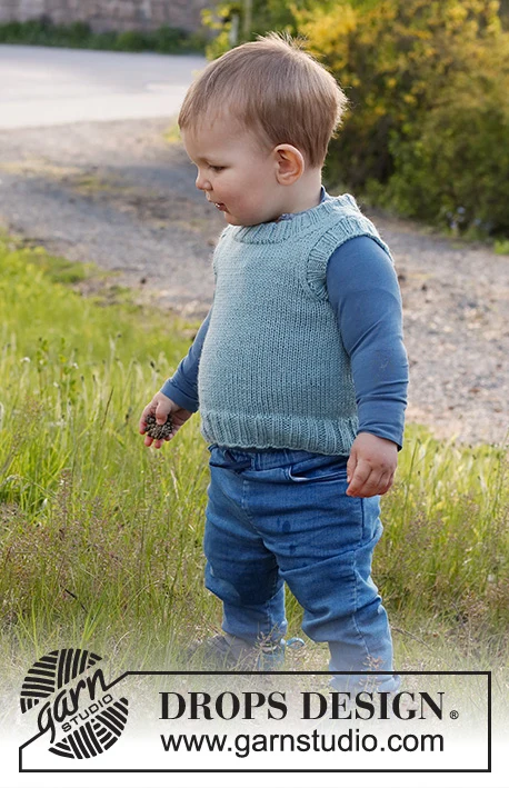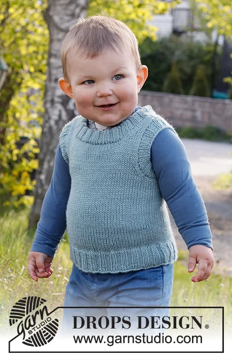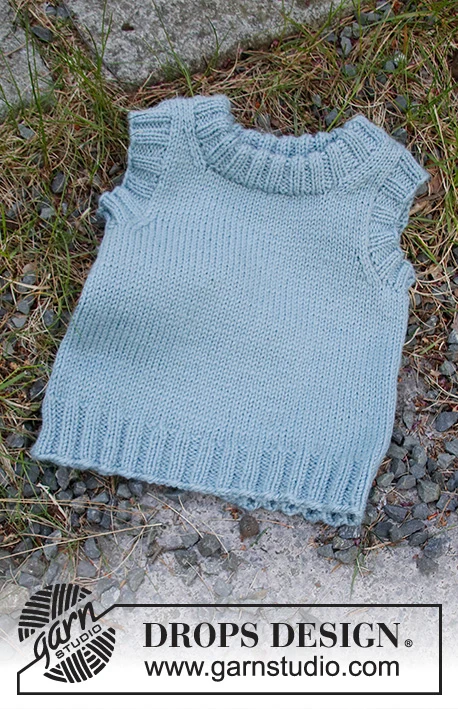 Neulottu liivi vauvalle ja lapsille DROPS Karismasta . Työ neulotaan sileää neuletta, jossa on kaksinkertainen pääntie. Koko 12 kuukautta - 12 vuotta.