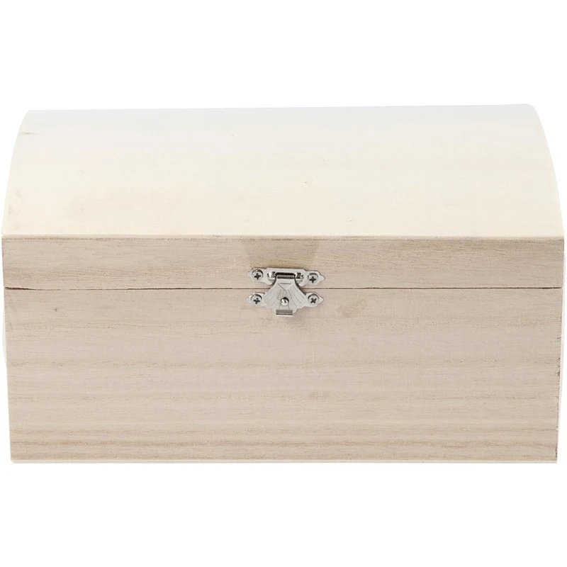 Puinen aarrearkku, jossa kaareva kansi ja lukko metallia.