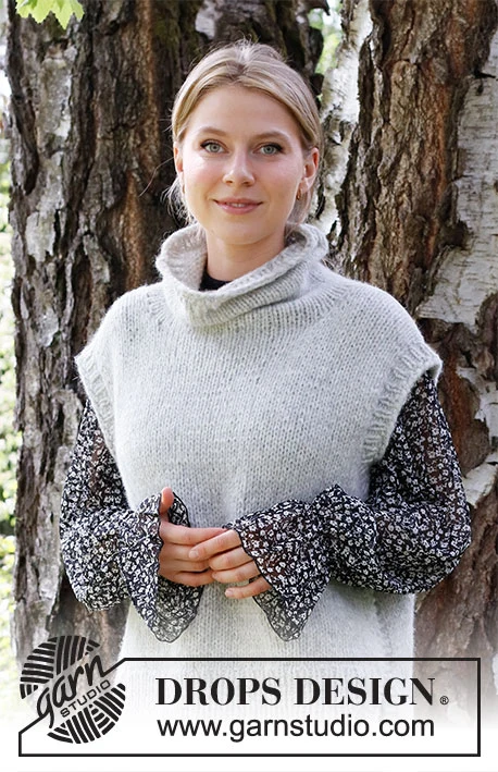 Neulottu 2-lankainen DROPS Air -liivi, jossa halkio sivuissa ja korkea pääntie. Koot XS-XXL.