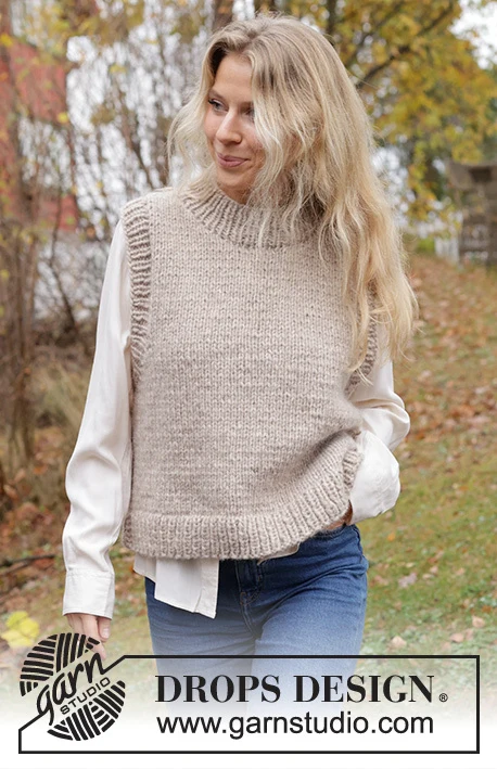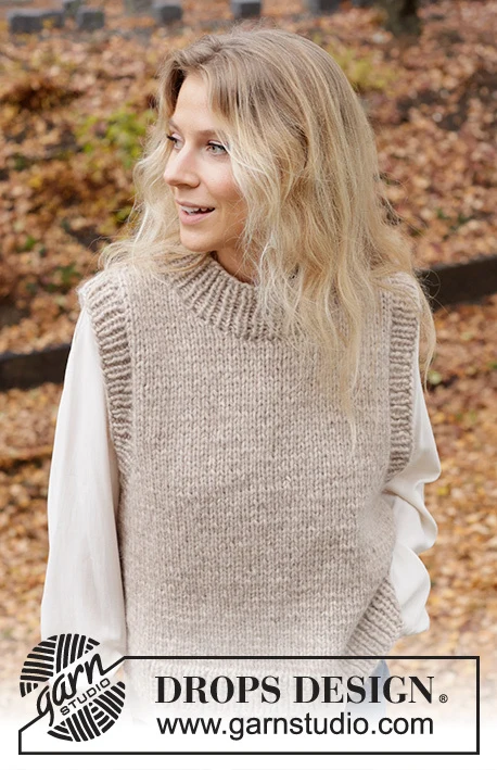 Neulottu toppapaita DROPS Wish -langasta . Liivi neulotaan sileää neuletta, jonka reunat ovat joustinneuletta ja sivussa halkio. Koko S-XXXL.