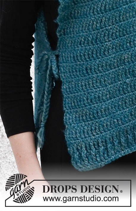 Virkattu liivi DROPS Sky- ja DROPS Kid-Silk -langoista . Työ on virkattu ylhäältä alas. Koko S-XXXL.