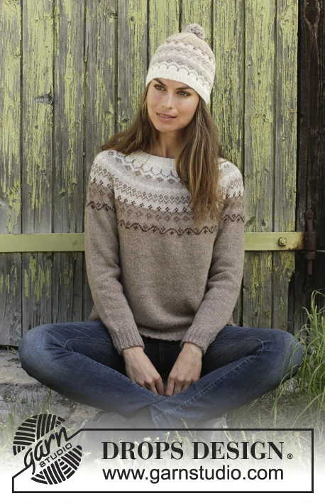 Neulottu pusero pyöreällä tukikappaleella DROPS Alpaca -langasta. Työ on neulottu ylhäältä alas pohjoismaisella kuviolla. Koko S-XXXL. Neulottu hattu pohjoismaisella kuviolla ja pomponilla DROPS Alpaca -langasta.