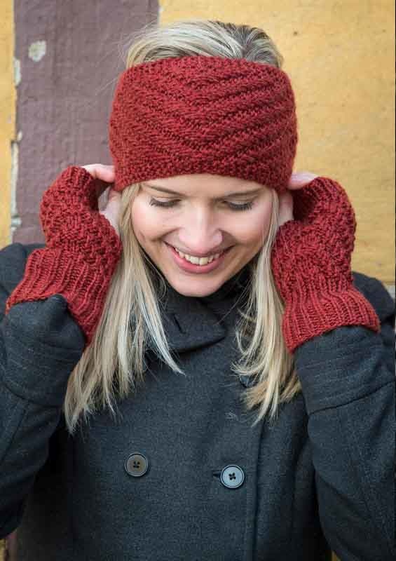 Pääpanta ja ranteenlämmittimet rakennekuviolla neulottu Mayflower Easy Care -langasta .