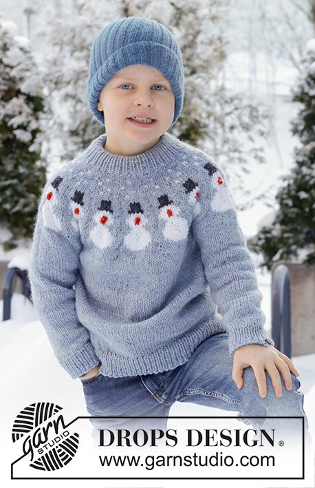 Lapsen ylhäältä alas neulottu pusero DROPS Nepal-langasta. Työssä on kaarroke, lumiukkokuvio ja kaksinkertainen pääntien reunus. Koot 2-14 vuotta. Teema: Joulu.