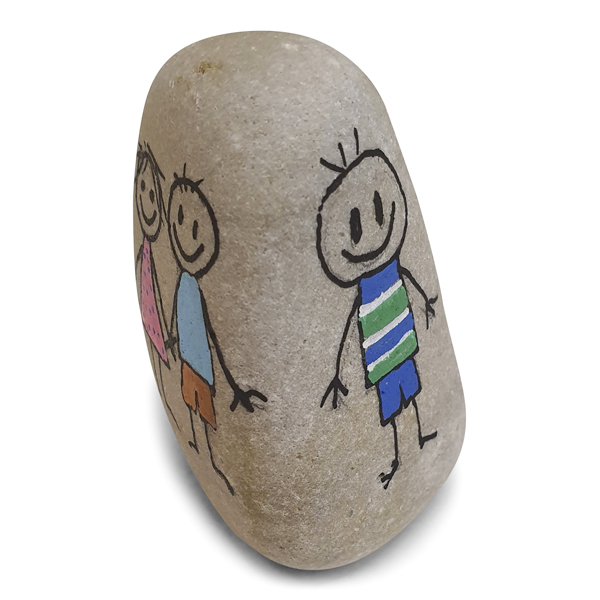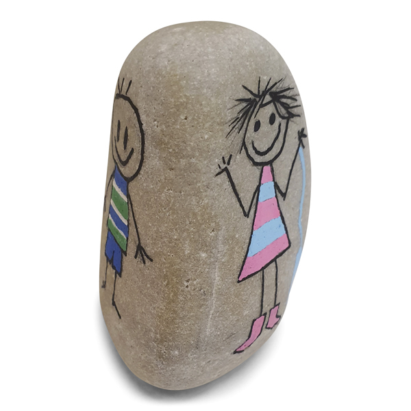 Tässä on maalattu kolmiomaiselle kivelle, jossa sekä tyttö että poika kahdelle sivulle ja kolmannelle puolelle tyttö ja poika seisomassa yhdessä, kuten tästä näkyy: