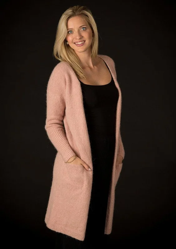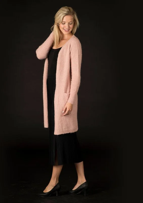 Pitkä moderni kaunis sileä ja tyylikäs takki, jossa leveä resorihelma ja Mayflower Sky Light -langasta neulotut sisätaskut.