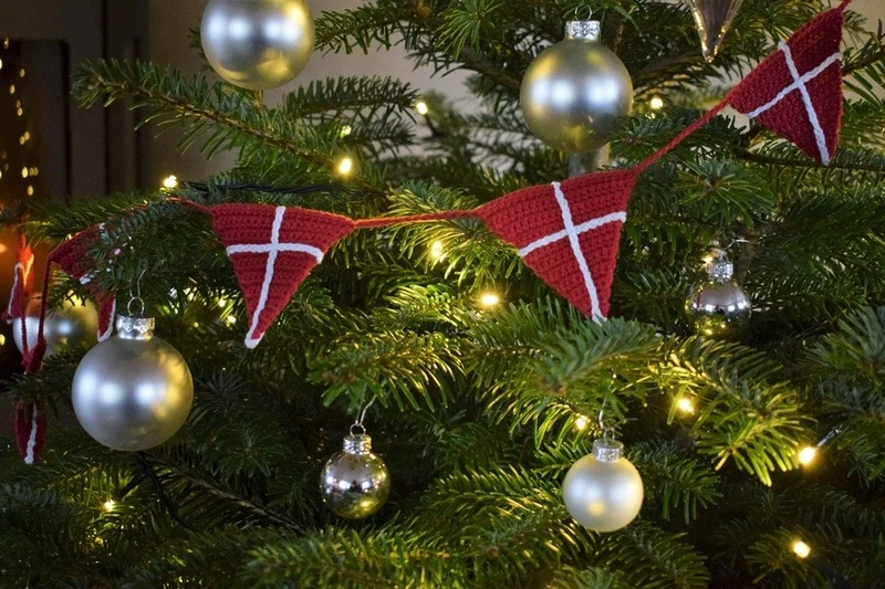 Tämä Dannebrog-viireillä varustettu lippuseppele on virkattu 2,5 mm:n koukulla Mayflower Cotton 8/4 -langasta .