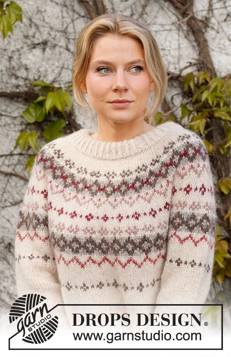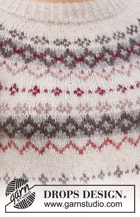 Neulottu pusero DROPS Air -langasta . Työ on neulottu ylhäältä alas pyöreällä tukikappaleella, pohjoismaisella kuviolla ja kaksinkertaisella pääntiellä. Koko S-XXXL.