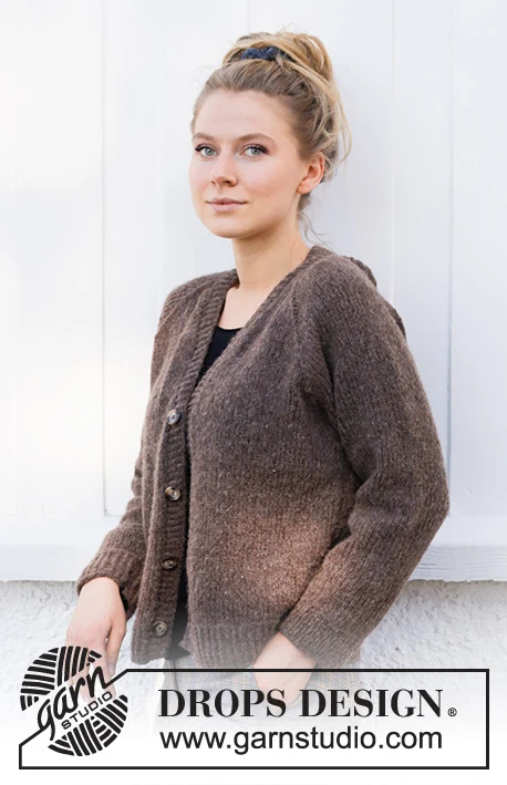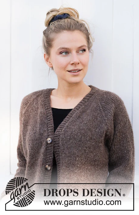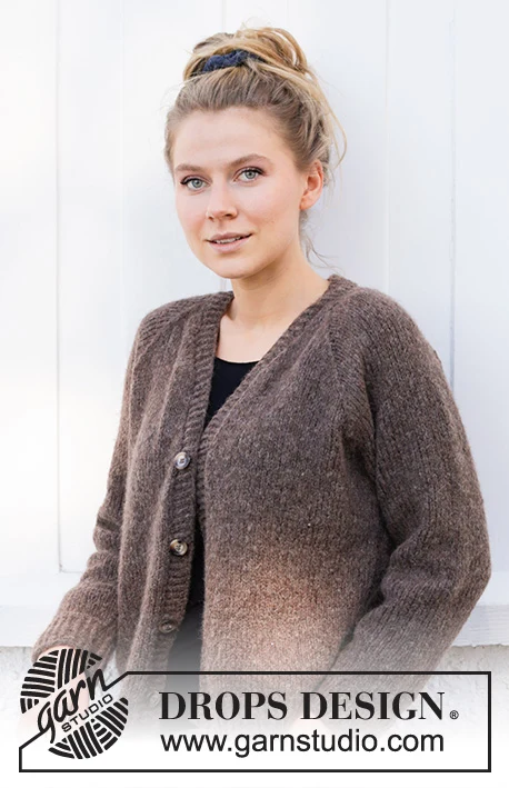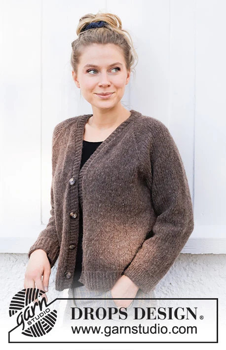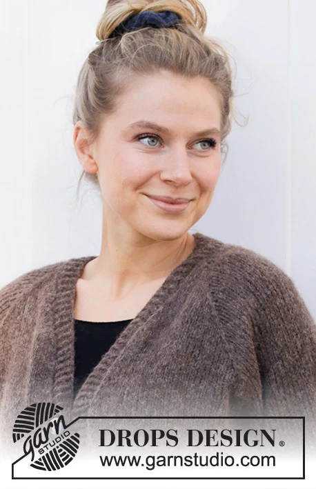 Neulottu raglan-takki DROPS Air -langasta . Työ on neulottu V-pääntiellä ja halkiolla sivuilla. Koko S-XXXL.