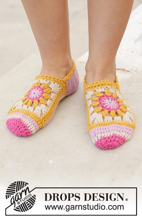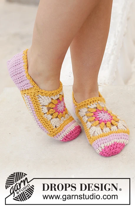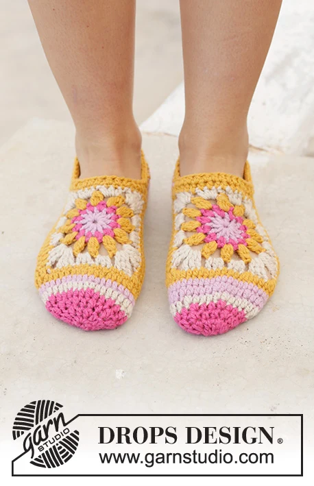 Virkatut tossut, joissa kukka ruudussa ja raidat DROPS Nepal -langasta . Koot 35-43.