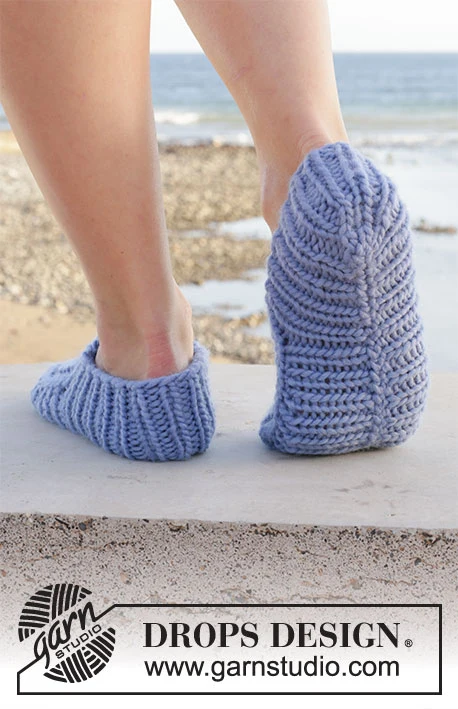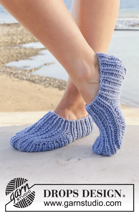 Neulotut tossut DROPS Snow -langasta . Työ on neulottu joustinneuletta ylhäältä alas. Koot 35-43.