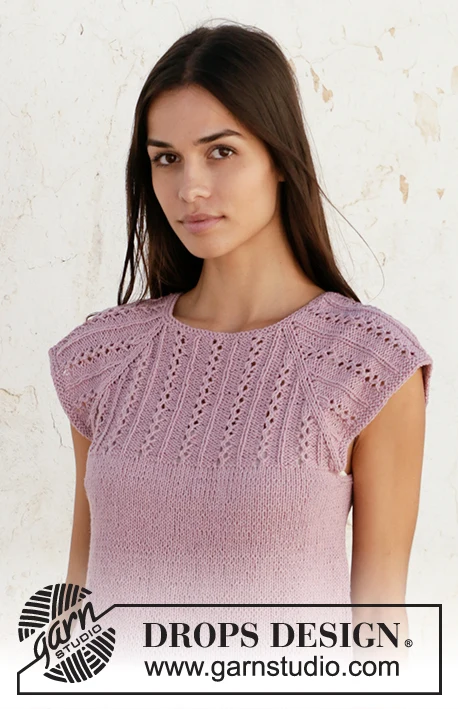 Neulottu raglantoppi DROPS Belle -langasta . Työ on neulottu ylhäältä alas reikäkuviolla. Koko S-XXXL.