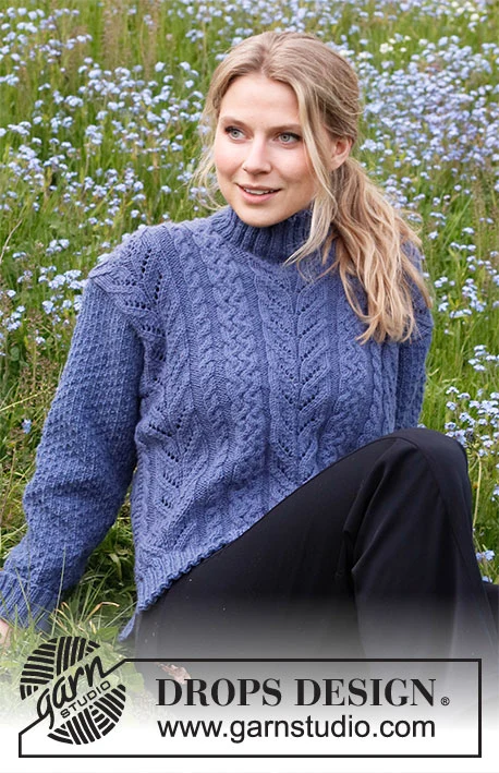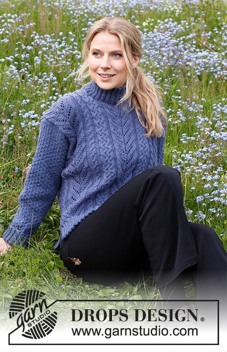 Neulottu pusero DROPS Merino Extra Fine -langasta . Työ on neulottu kierteillä, reikäkuviolla, rakennekuviolla ja korkealla pääntiellä. Koko S-XXXL.