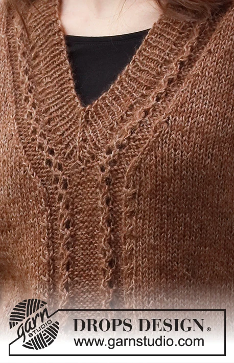 Neulottu v-pääntie DROPS Flora- ja DROPS Kid-Silk -langoista . Koko S-XXXL.