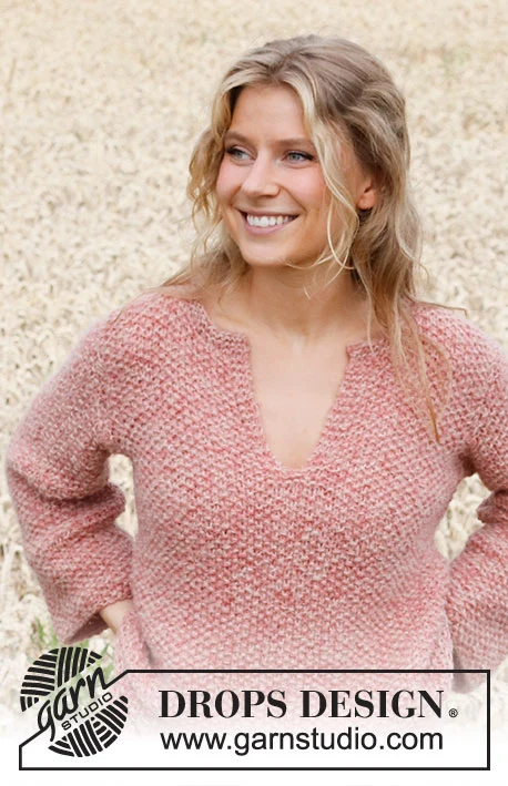 Neulottu pusero DROPS Sky- ja DROPS Brushed Alpaca Silk -langoista . Työ on neulottu helmityönä halkiot pääntiessä ja halkiot sivuissa. Koko S-XXXL.
