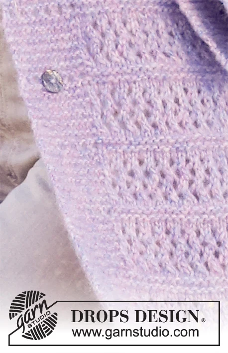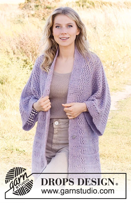 Hihaton neulottu DROPS Air - takki . Työ on neulottu reikäkuviolla ja huivikauluksella. Koko S-XXXL.