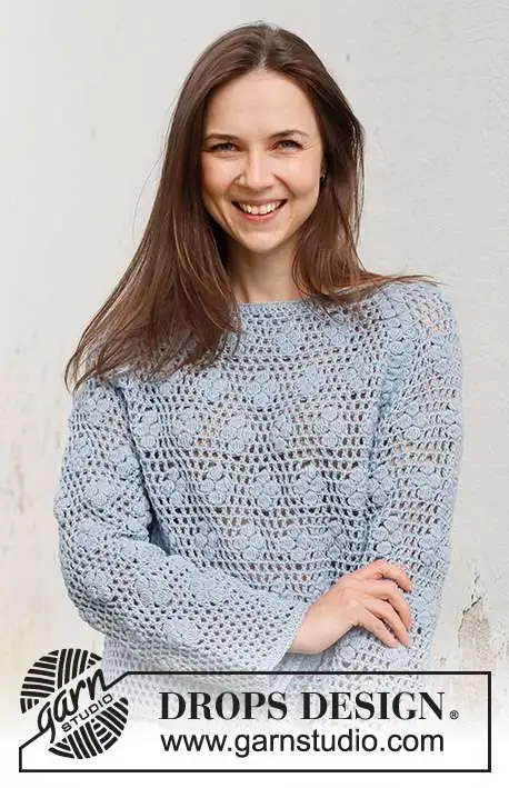 Virkattu pusero DROPS Cotton Merino -langasta . Työ on virkattu ylhäältä alas raglanilla, reikäkuviolla, kuplia ja viuhkakuviolla. Koko S-XXXL.
